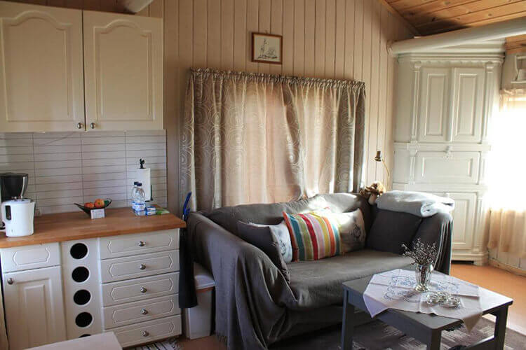 Cette petite cabane au toit végétal est connue sous le nom de « Stabbur » et dispose d’une bouilloire électrique, d’un poêle à bois et d’une vue sur les chiens. La salle de bains commune se trouve à quelques pas dans le bâtiment principal.